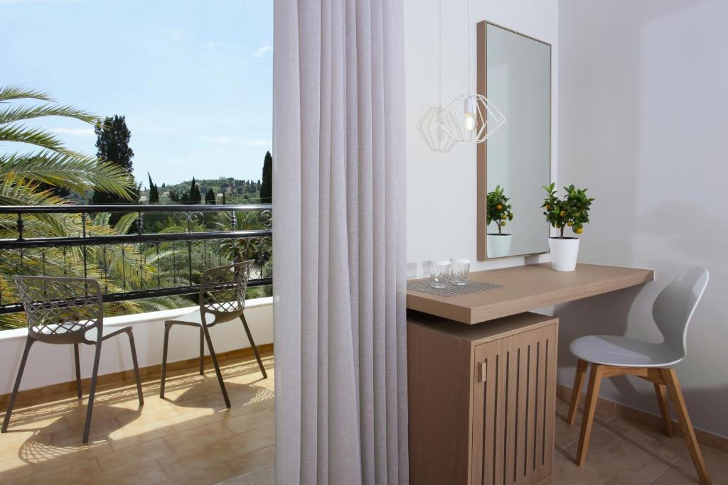 Servizi: reception, ascensore, bar, ristorante stile buffet per la prima colazione, piscina con lettini ed ombrelloni gratuiti, pool bar, sala TV satellitare, aperitif bar, servizio lavanderia (a pagamento), culla gratuita (su richiesta), cassette di sicurezza, giardino, deposito bagagli, bigliardo, ping-pong e parcheggio privato gratuito. Vicino all'hotel a circa 10 minuti a piedi c'è anche una fermata del bus pubblico per il centro Corfù città.